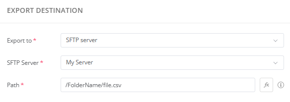 Tip: Assign a dynamic name to the file with a date suffix to create an history By using a suffix (the export date) at the end of the path, you can dynamically add the date to a file name, allowing for history rather than overwriting the same file on every export. Here is an example with a dynamic access path (you must check the fx function) : |