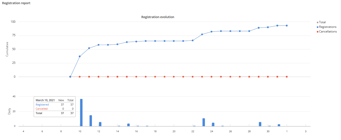 In the upper part of the page, there is a report on the evolution of the registrations over the days: