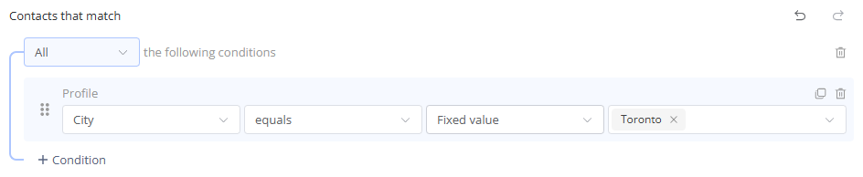 This first example is simple. We use a Profile type condition (in the Contact data section). We use the City field for targeting. The City field value must be filled in the profile of a contact for that contact to be included in the group. |