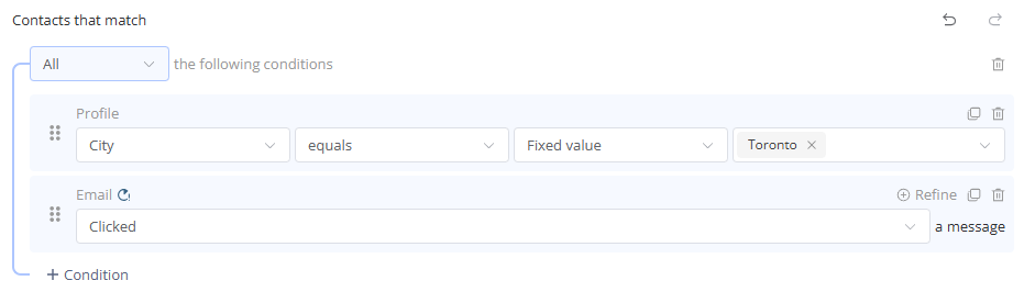 Example 3: Group that targets contacts whose city is Toronto AND who clicked a link in a message