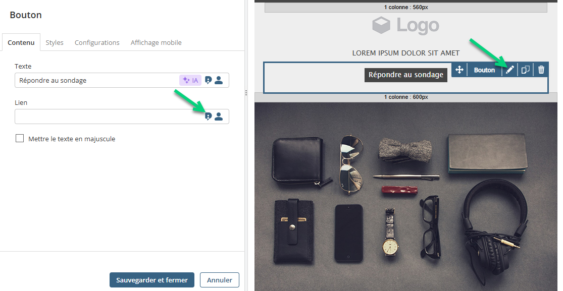 Pour partager le sondage à vos contacts, insérez le sondage dans une communication. Pour un courriel, vous pourriez insérer le sondage dans un bouton d'appel à l'action. Dans l'édition du bouton, cliquez sur l'icône d'outils DI et sélectionnez votre sondage dans la catégorie Sondages :