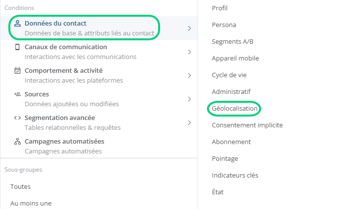 Dans vos communications (courriels, SMS ou notifications Push) ou vos campagnes automatisées, vous pouvez inclure un groupe qui cible les contacts selon les méthodes de géolocalisation configurées dans le projet :