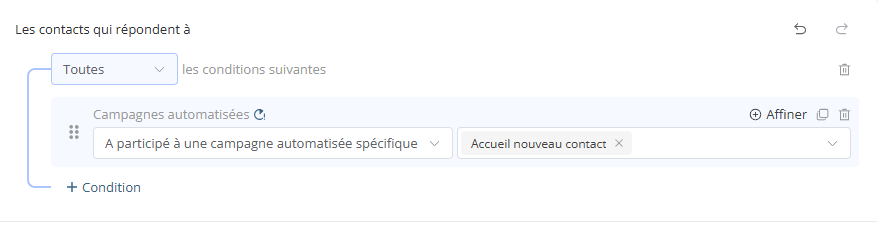 Vous pourriez créer un Groupe pour cibler les contacts qui ont participé à une campagne automatisée. Ce ciblage pourrait, par exemple, servir à faire un suivi auprès des contacts qui ont complété une campagne d'inscription à un webinaire. Ainsi, vous ciblez seulement les contacts inscrits au webinaire.