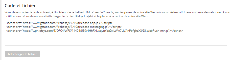 - Dans la section Code et fichier, copiez-collez le code (script) sur toutes les pages de votre site Web où vous désirez afficher la notification Push. Insérez le code à l'intérieur de la balise <head></head> ou juste avant la balise </body>. La version la plus à jour au moment de la mise à jour de cet article est 7.4.0.