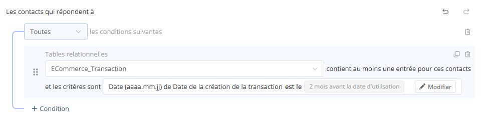 Dans cet exemple, la table utilisée est la table Transaction, une table générée automatiquement lorsqu'on active le E-commerce. On inclut ici tous les contacts qui ont fait un achat dans les 2 derniers mois.