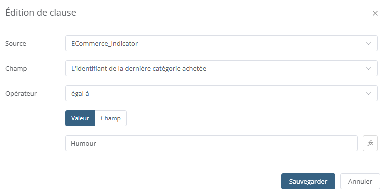 Utilisez une condition de type Indicateurs e-commerce (dans Requêtes) et, sous la condition, cliquez sur Ajouter des critères pour ajouter une clause avec la source ECommerce_Indicator :