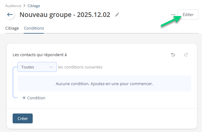 Aucune : Sert à créer un groupe d'exclusion. Un contact qui ne rencontre aucune des conditions du groupe sera inclus dans ce groupe d'exclusion.