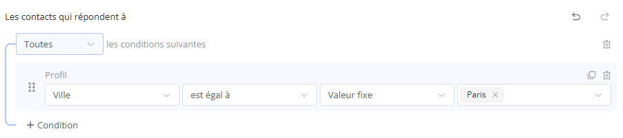 Ce premier exemple est assez simple. On utilise une condition de type Profil. (dans la catégorie Données du contact). On utilise le champ Ville pour le ciblage. La valeur du champ Ville dans le profil d'un contact doit être renseignée pour que le contact soit inclus dans le groupe. |