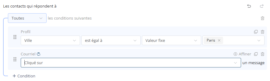 Exemple 3 : Groupe qui cible les contacts dont la ville est Paris ET qui ont cliqué dans un message